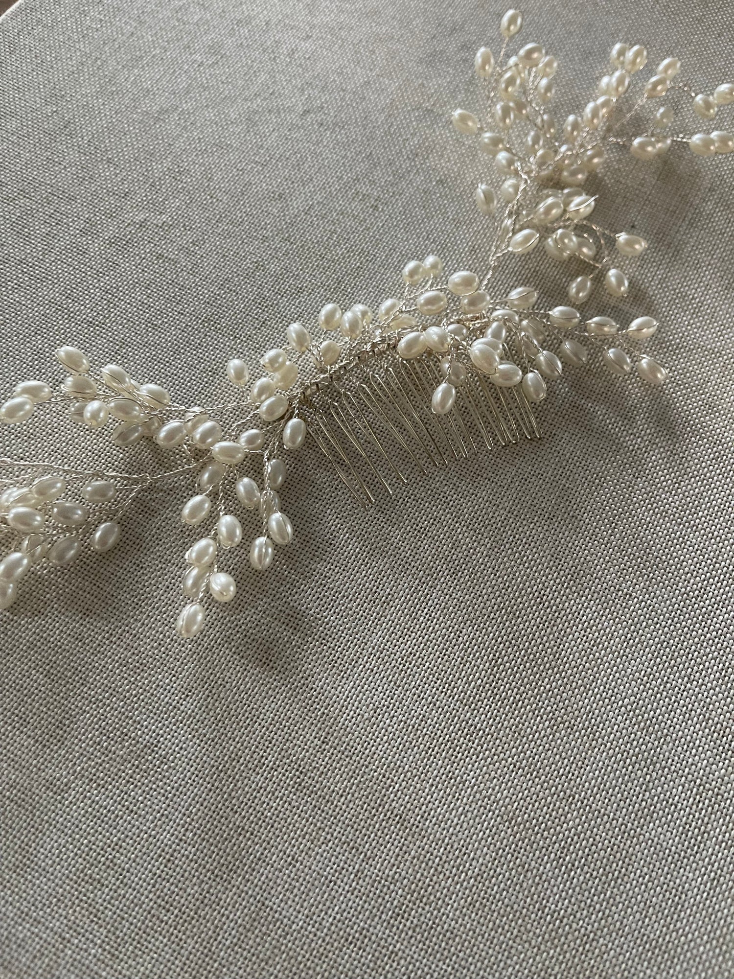 Create a look of breathtaking, natural elegance with this ethereal silver and pearl hair comb. Stretching an impressive 10 inches wide, this flexible piece features delicate, hand-wired sprays of luminous pearls, evoking the timeless beauty of baby's breath. A truly romantic final piece, it's waiting to add a whisper of classic beauty to your special occasion.