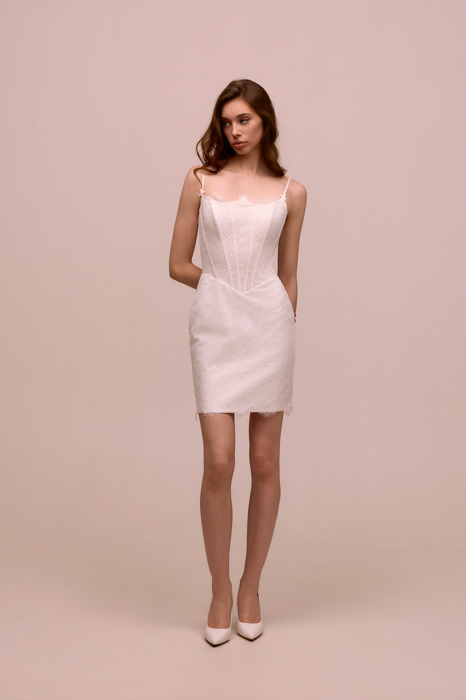 Romantic and quietly radiant, Elodie features a structured corset bodice, delicate lace overlay, and dainty straps. A hidden layer of glitter tulle beneath the lace adds a subtle, ethereal shimmer—catching the light with every step. Soft, scalloped edging completes the look with vintage-inspired charm.
