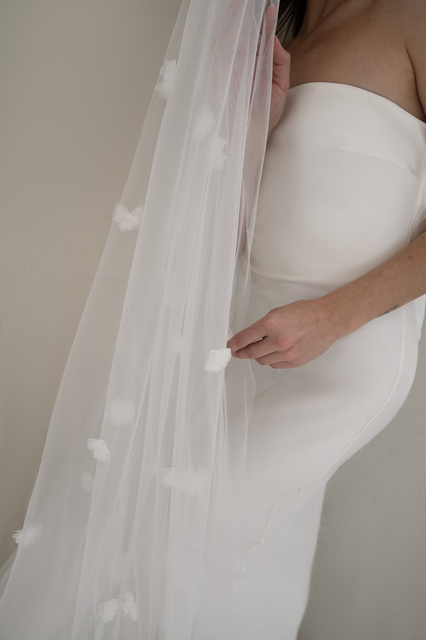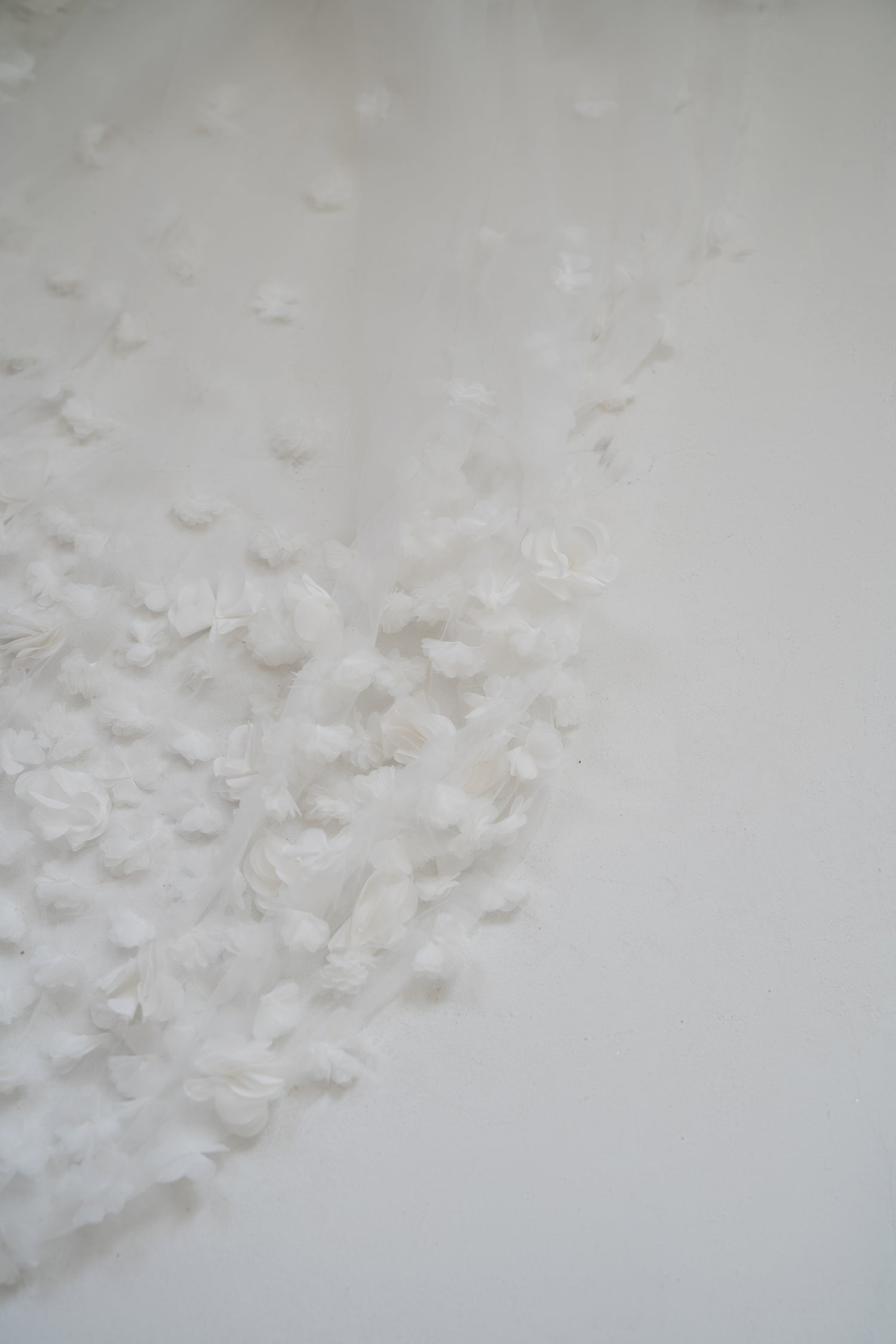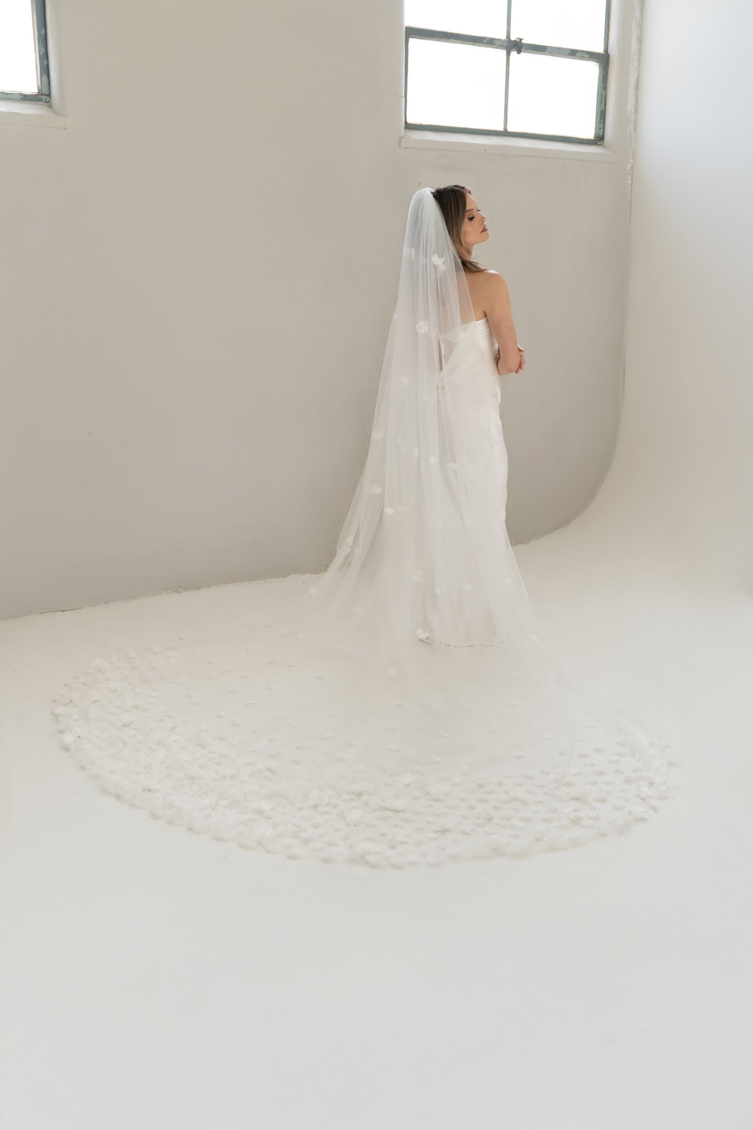 The Lumière veil brings a dreamy, ethereal finish to any bridal look. Crafted from our signature Heirloom Tulle™, it features hundreds of soft, hand-applied petals that cluster at the train and scatter upward like floating blossoms. With its sheer cathedral-length drape, Lumière feels light as air while making a bold, romantic statement.