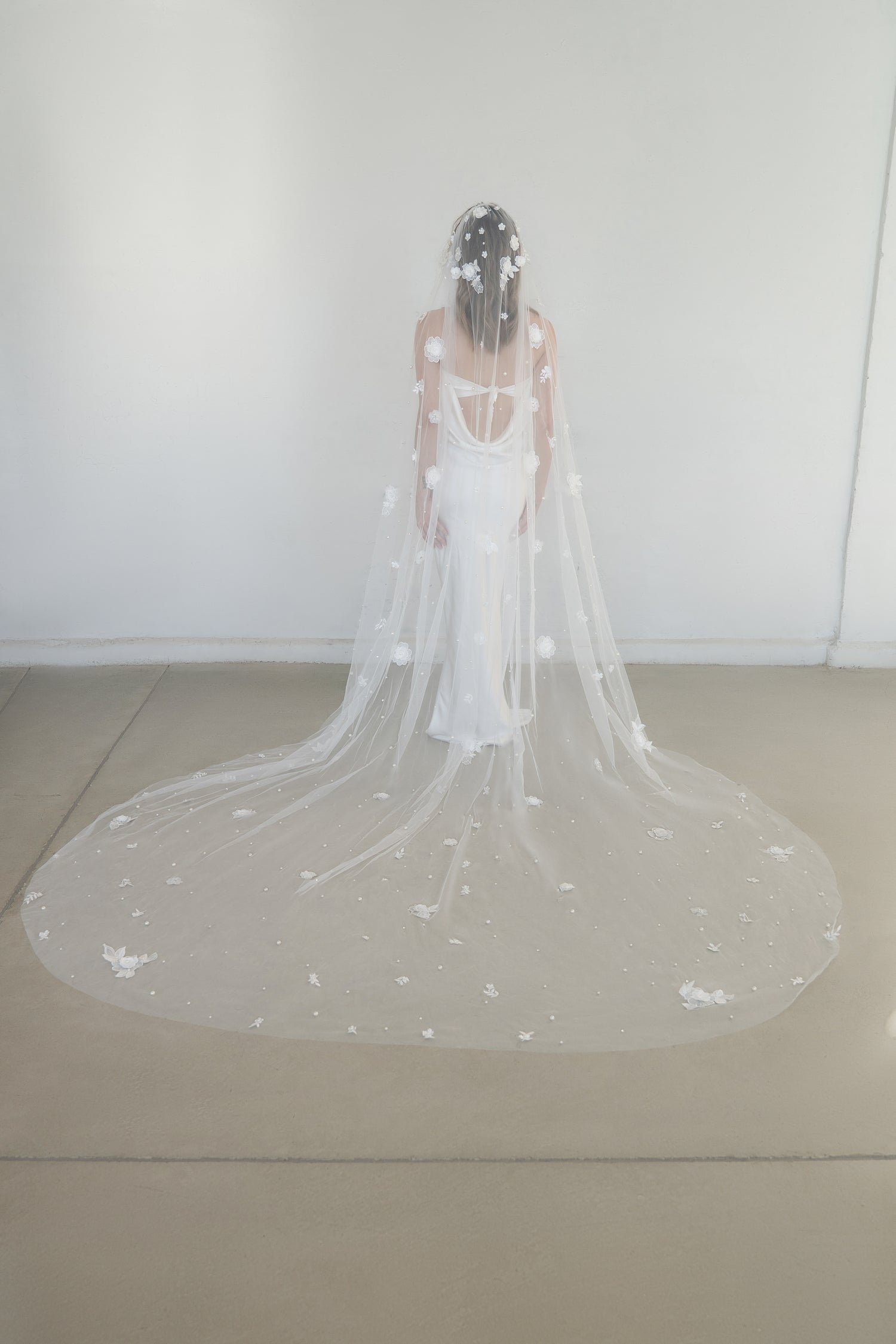 The Fleurette veil is a dreamy cathedral-length design crafted from our signature Heirloom Tulle™, offering a soft, sheer drape with a luxurious finish. This single-tier style features a delicate scattering of hand-applied floral appliqués, petite 3D flowers, and pearls that cascade organically from crown to train. The result is an airy, garden-inspired veil that feels both whimsical and modern—perfect for the bride seeking movement, texture, and subtle sparkle.