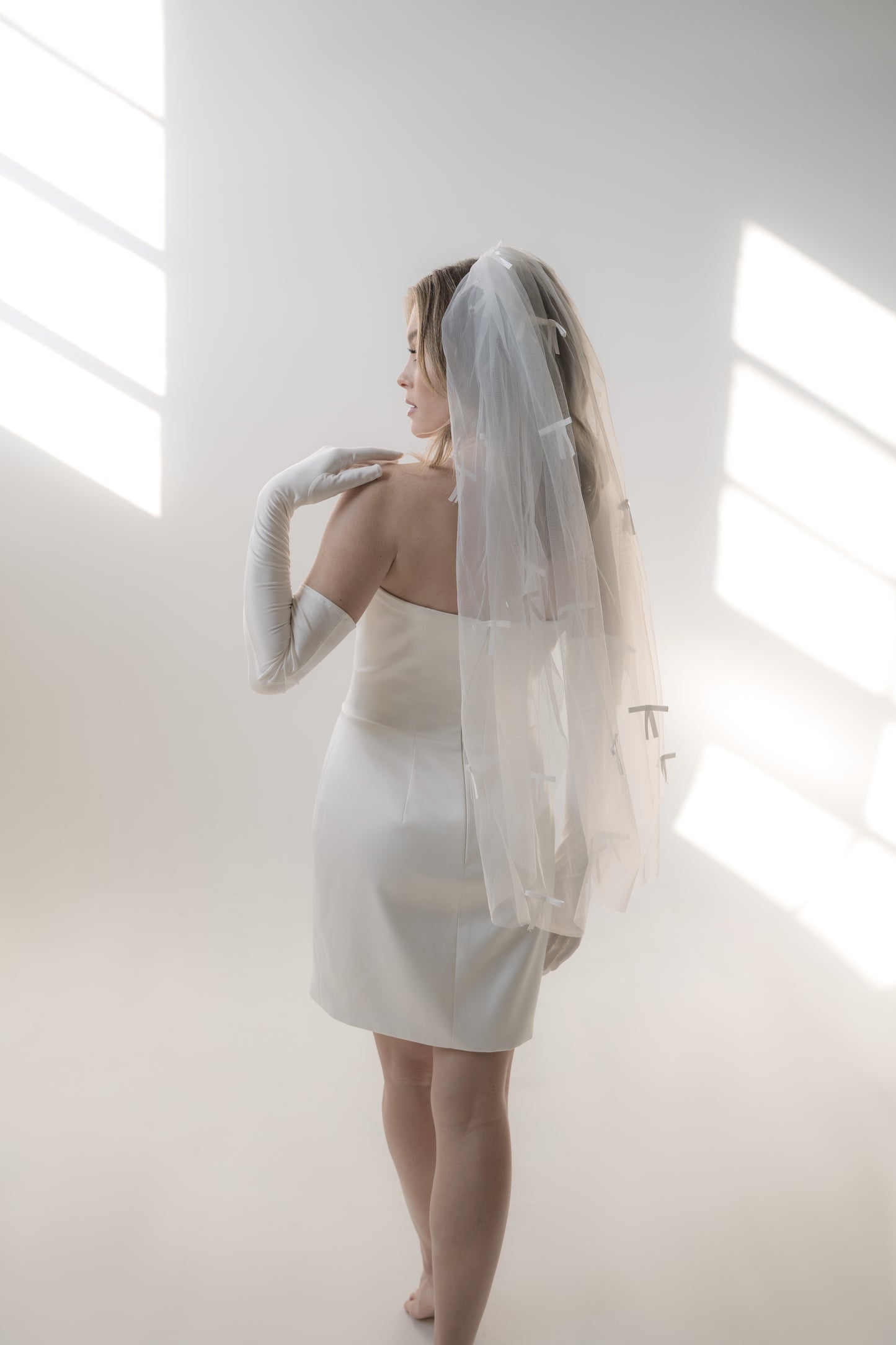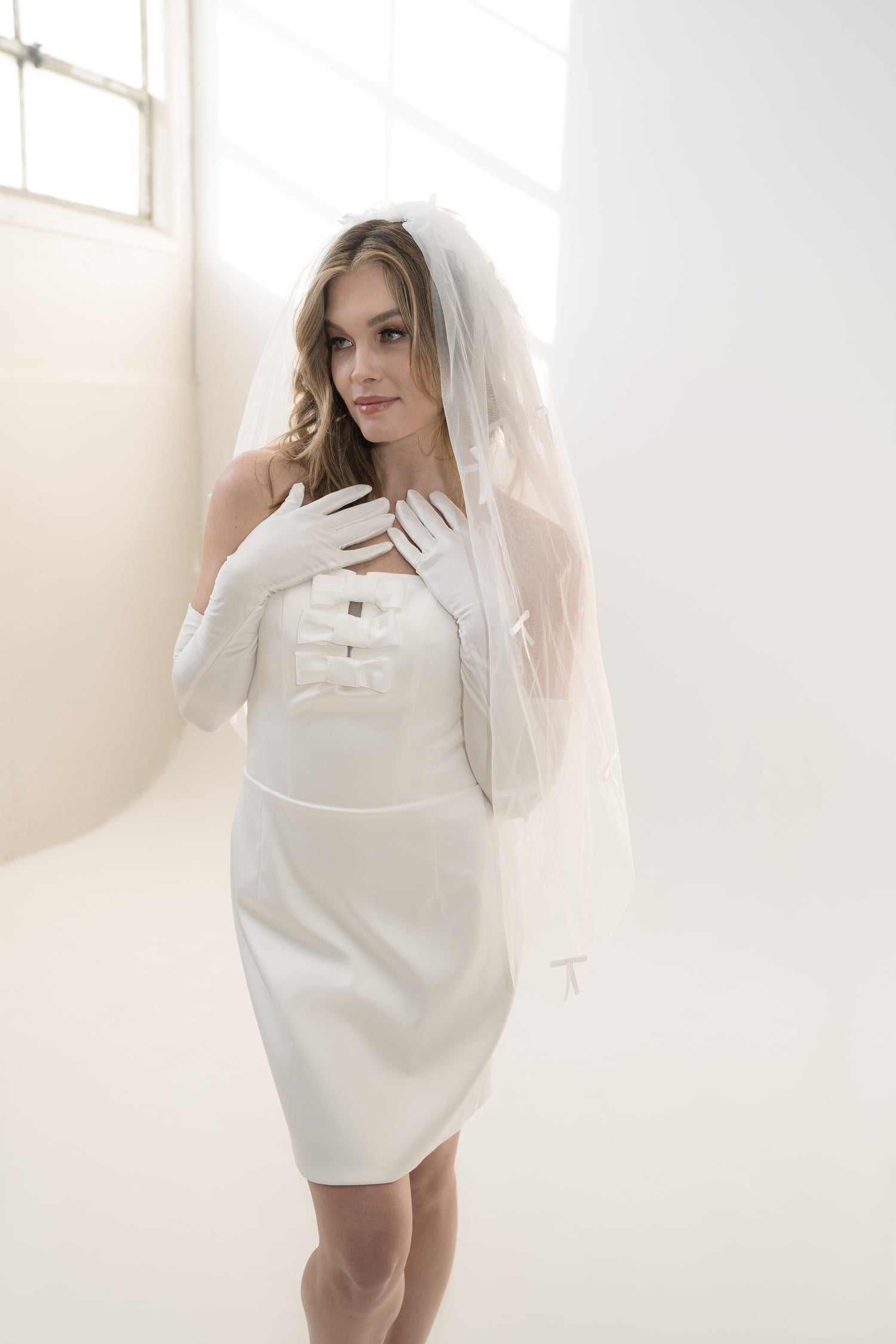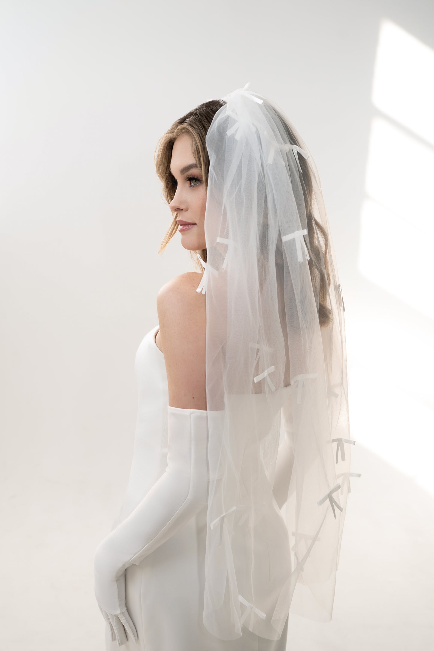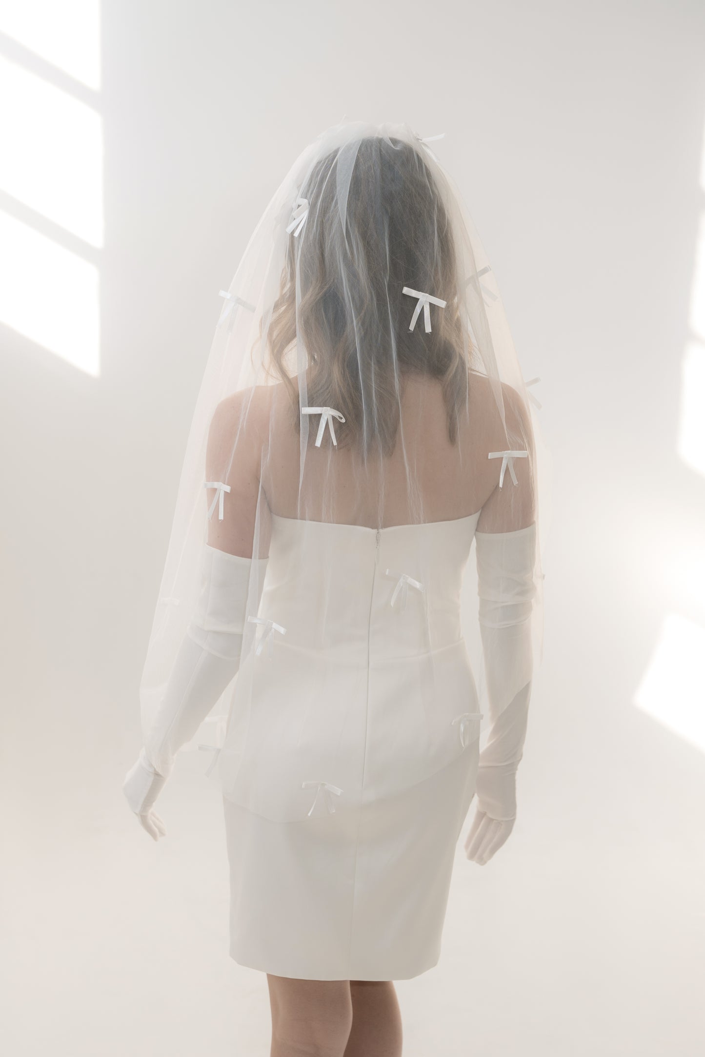 The Bardot veil is a chic, fingertip-length design made from our signature Heirloom Tulle™, offering soft volume with a clean silhouette. Scattered bows are hand-sewn throughout for a playful, fashion-forward finish. This veil is perfect for brides seeking something fresh, flirty, and fun—ideal for modern ceremonies, second looks, or courthouse chic.