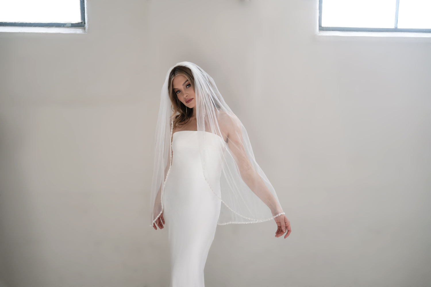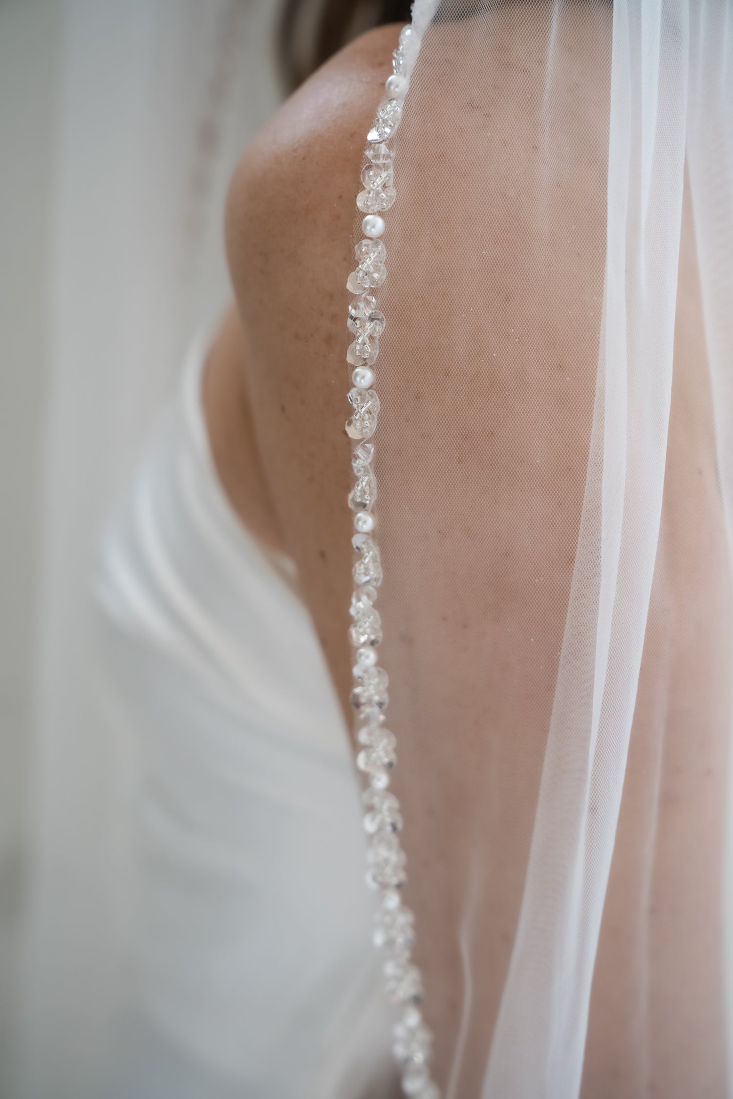 The Celestine veil is a fingertip-length style crafted from our signature Heirloom Tulle, known for its fluid drape and whisper-soft texture. This classic silhouette is elevated with a delicate edge of hand-sewn beading—featuring clusters of tiny pearls and crystal accents for just the right amount of shimmer. Lightweight and timeless, it's the perfect veil for brides seeking something elegant and versatile.