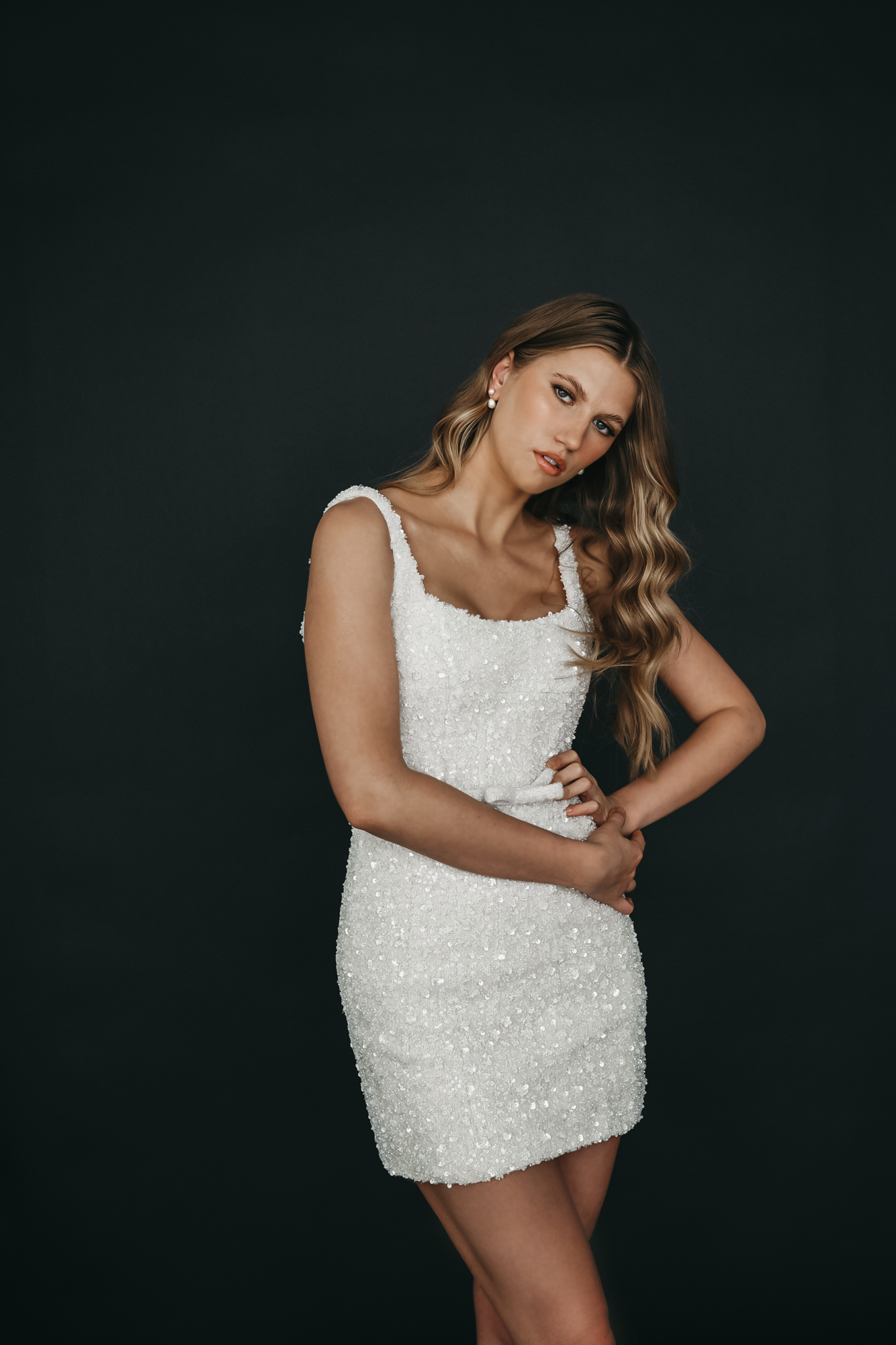 A sweet little thing that gives old money. Her beading adds the perfect dash of glam to her delightfully simple silhouette.
