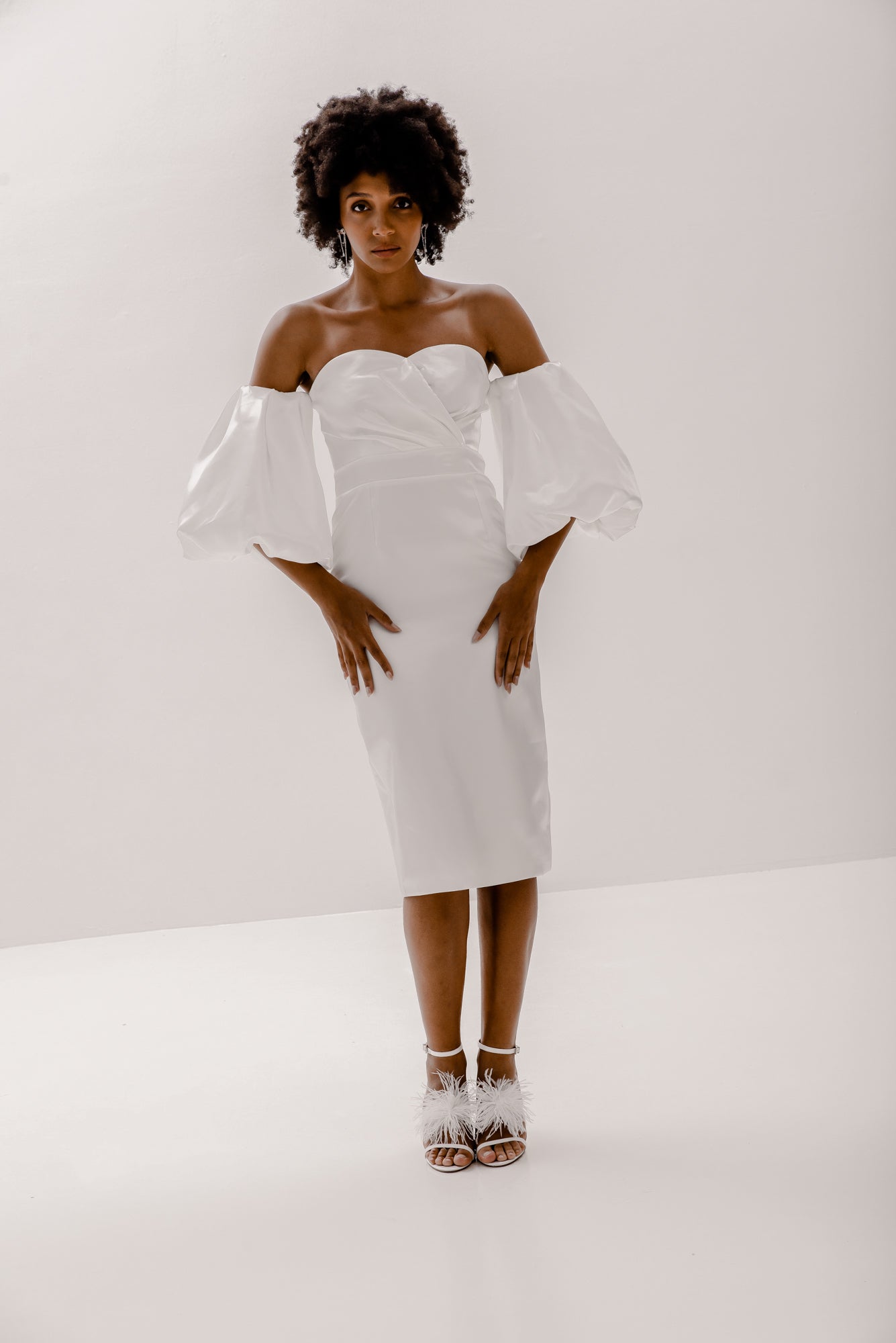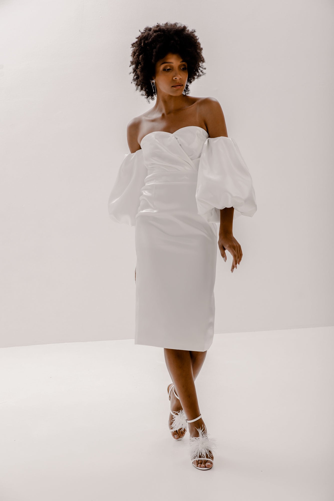 Featuring removable bell sleeves, her simple, chic silhouette make her the perfect party dress.