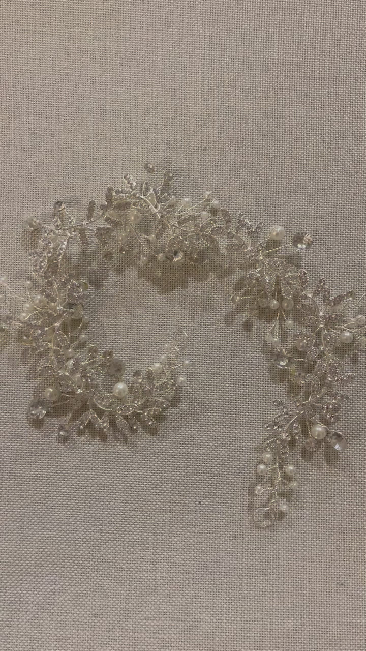 Add a touch of celestial shimmer to your bridal hairstyle with this exquisite hair vine. Measuring 14 inches, its flexible design features hand-wired branches of luminous pearls and sparkling crystals that can be beautifully woven into an updo or braid. A truly magical final piece, it's waiting to become a cherished part of your wedding day look.