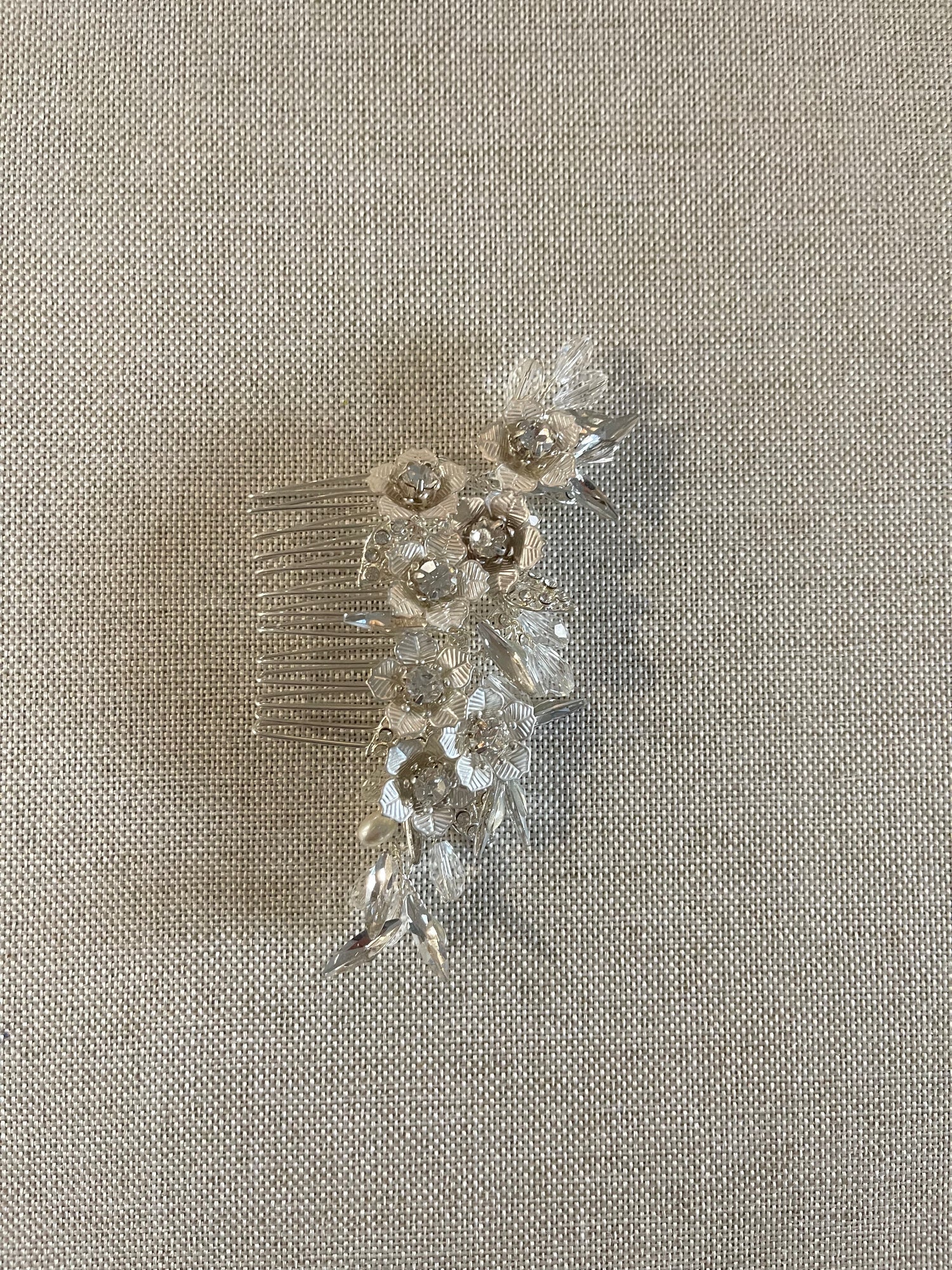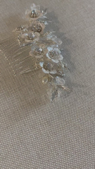 Discover exquisite, three-dimensional artistry in this stunning 4-inch silver hair comb. Artfully layered with opalescent floral petals, shimmering crystals, and delicate pearl accents, this piece offers a soft, luminous glow from every angle. This is the last one in our collection—a truly unique heirloom for a memorably romantic look.