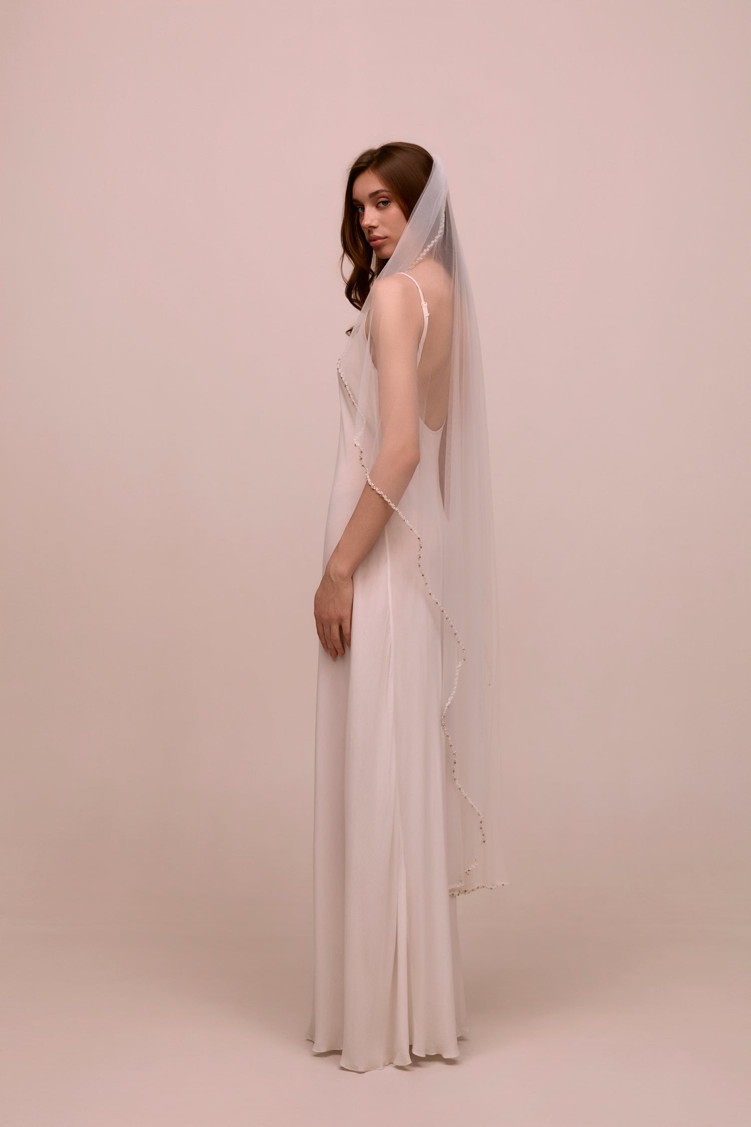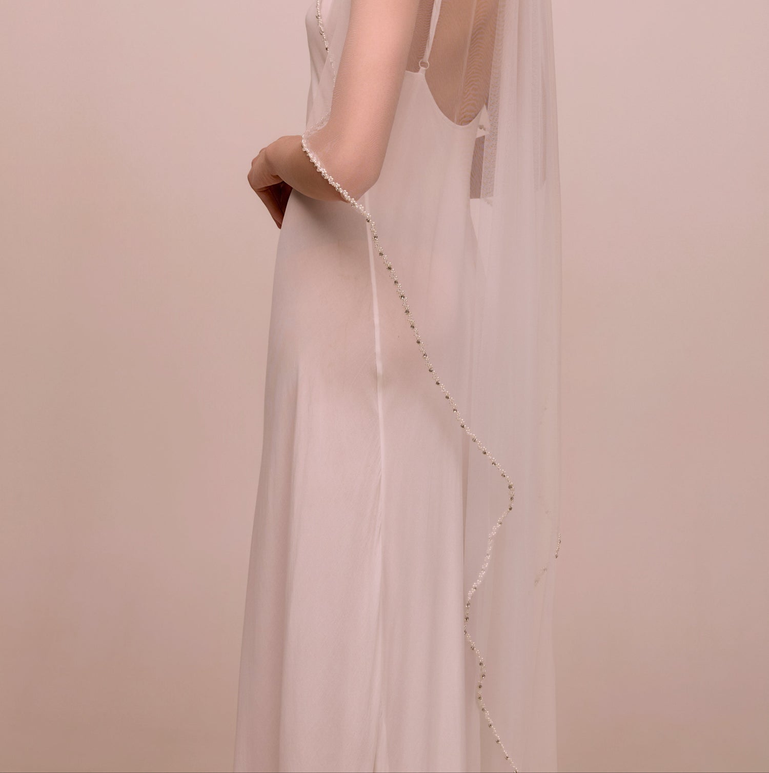 Crafted from our Heirloom tulle®.  Simple, sculptural, and effortlessly polished. VS26-04 features a soft sheer drape with delicate pearl beading hand-stitched along the edge. A modern classic that pairs beautifully with both minimal and embellished gowns.