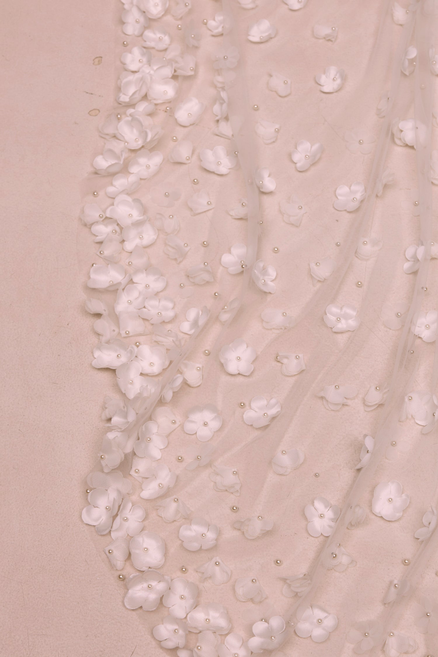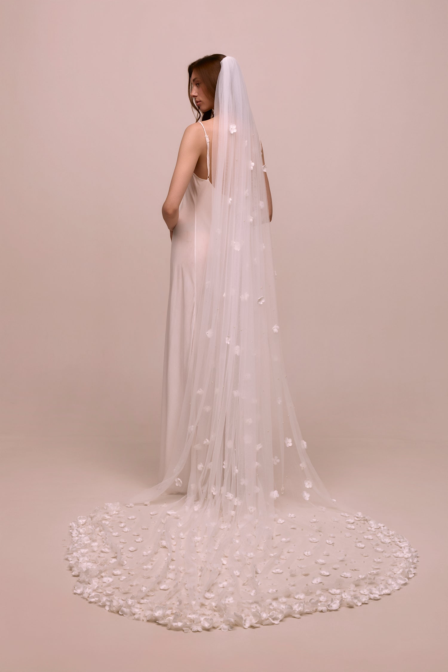 Crafted from our Heirloom tulle®. Soft, sculptural, and utterly romantic, VS26-12 features a cathedral-length silhouette adorned with hundreds of hand-sewn 3D flowers and pearls cascading from crown to train. The effect is ethereal—like a trail of blossoms following every step. A perfect blend of whimsy and drama for the bride who wants to bloom as she walks down the aisle.